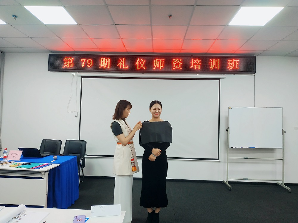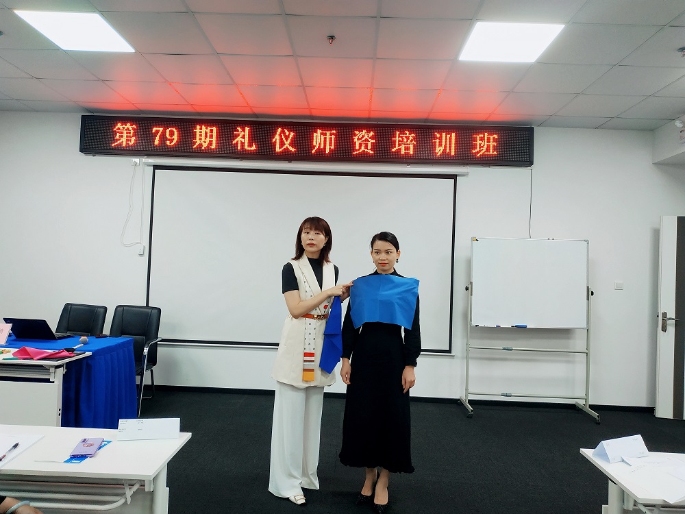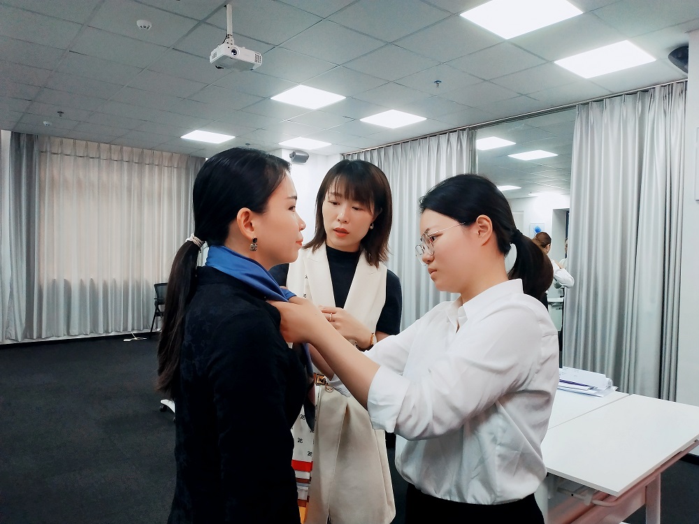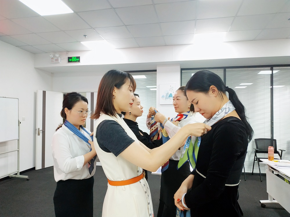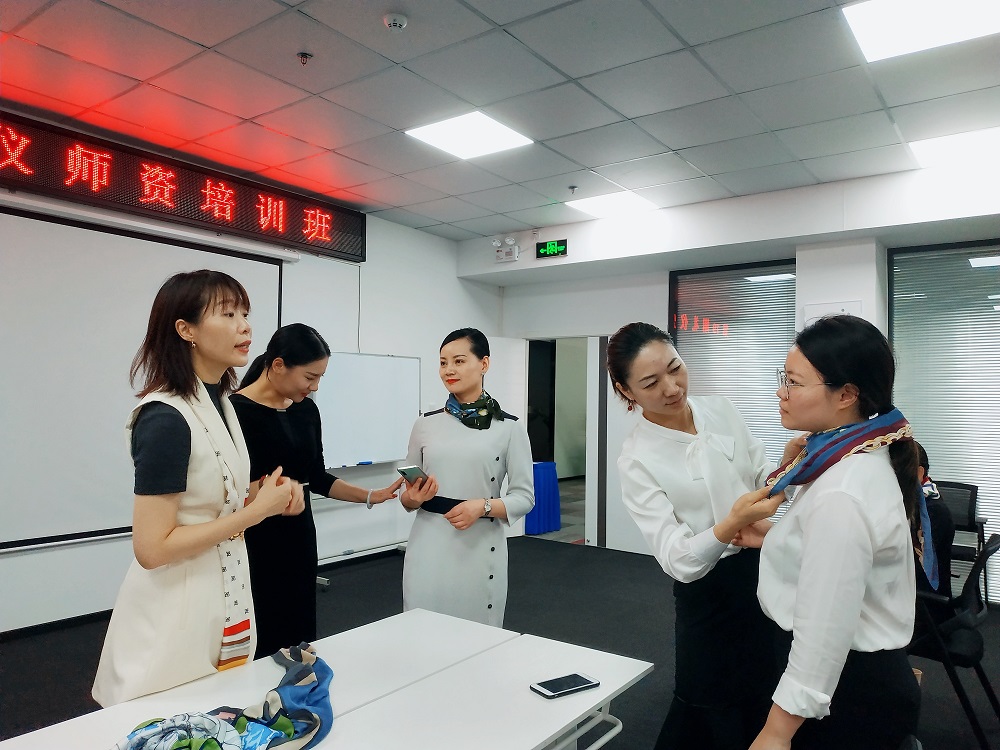 劉老師為大家講解了服裝色彩搭配等方面的理論知識,并教授學(xué)員如何根據(jù)自己的膚色來選擇適合自己的服裝、如何根據(jù)體形進(jìn)行搭配服裝、如何靈活運(yùn)用絲巾搭配來打造職業(yè)禮儀培訓(xùn)師的專業(yè)形象。