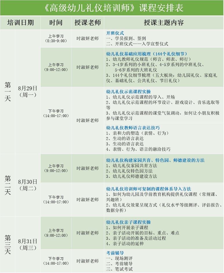 目前很多學(xué)前教育機(jī)構(gòu)、幼兒園已經(jīng)開展了禮儀課程,為了解決各地幼兒禮儀培訓(xùn)師資緊缺的問題,幫助幼兒禮儀教育工作者掌握禮儀教學(xué)訓(xùn)練內(nèi)容和教學(xué)規(guī)范、增強(qiáng)實(shí)際應(yīng)用授課能力、提高師資水平和質(zhì)量,建立專業(yè)幼兒禮儀培訓(xùn)教師隊(duì)伍,增強(qiáng)禮儀實(shí)際應(yīng)用及教育成果轉(zhuǎn)化,知行德禮教育、廣州市禮儀協(xié)會將于2022年8月29日--31日在廣州舉辦《高級幼兒禮儀培訓(xùn)師》詳情如下: