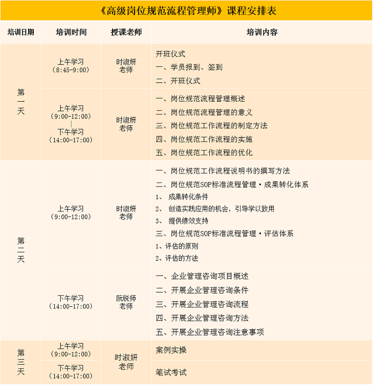 學習費用:5980元/人,含國內(nèi)權(quán)威機構(gòu)認證的 【高級崗位規(guī)范流程管理師】證書。(學習費用可刷公務(wù)卡繳費)。