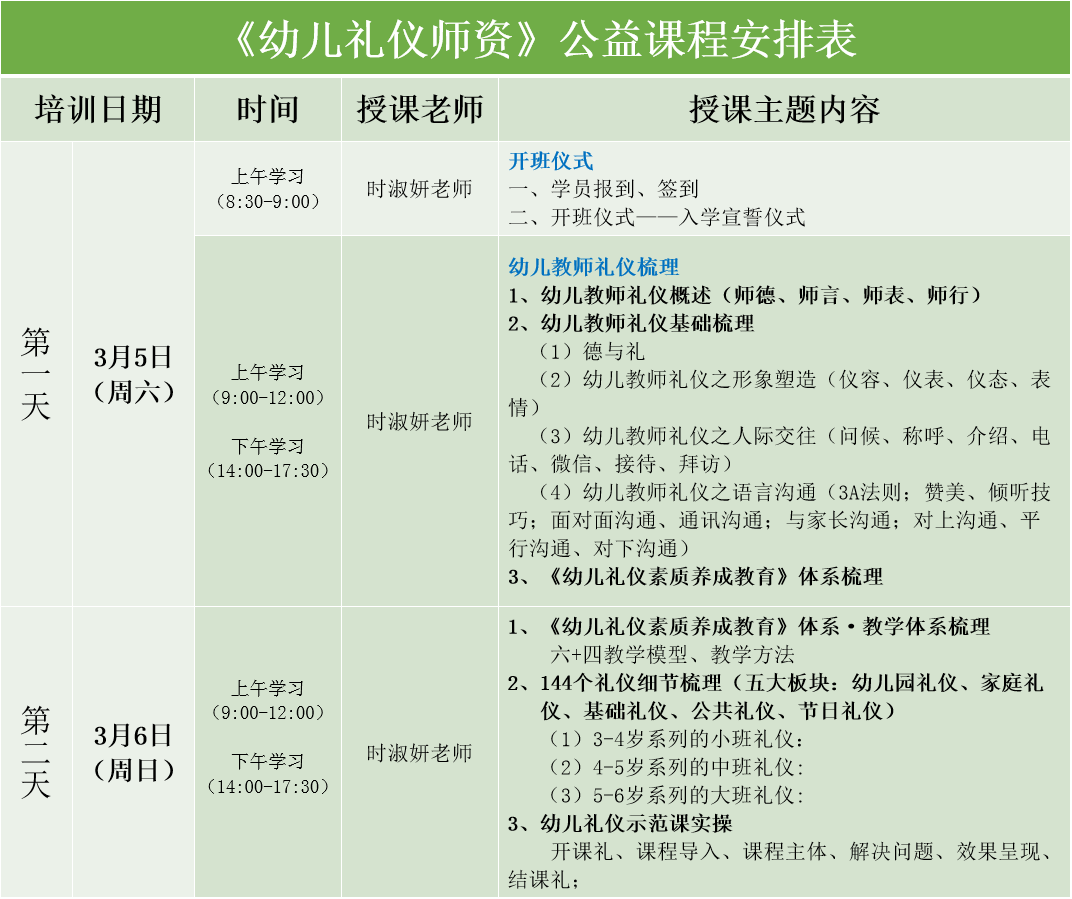禮儀作為內在的品德、品質、修養(yǎng)的承載體和言行舉止、待人接物、與人交往溝通具體行為表達,是成長至關重要的素質,也是好家風家教的成果展現(xiàn),更是社會文明程度的體現(xiàn)。為了解決幼兒禮儀培訓師資緊張的問題,幫助幼兒禮儀教育工作者掌握禮儀訓練內容和教學規(guī)范、增強實際應用授課能力、提高師資水平,建立幼兒禮儀授課專業(yè)教師隊伍,增強禮儀實際應用及教育成果轉化,廣州市禮儀協(xié)會、廣州市德禮教育將于2022年3月5日—6日在廣州開展《幼兒禮儀師資》公益培養(yǎng)計劃。詳情如下: