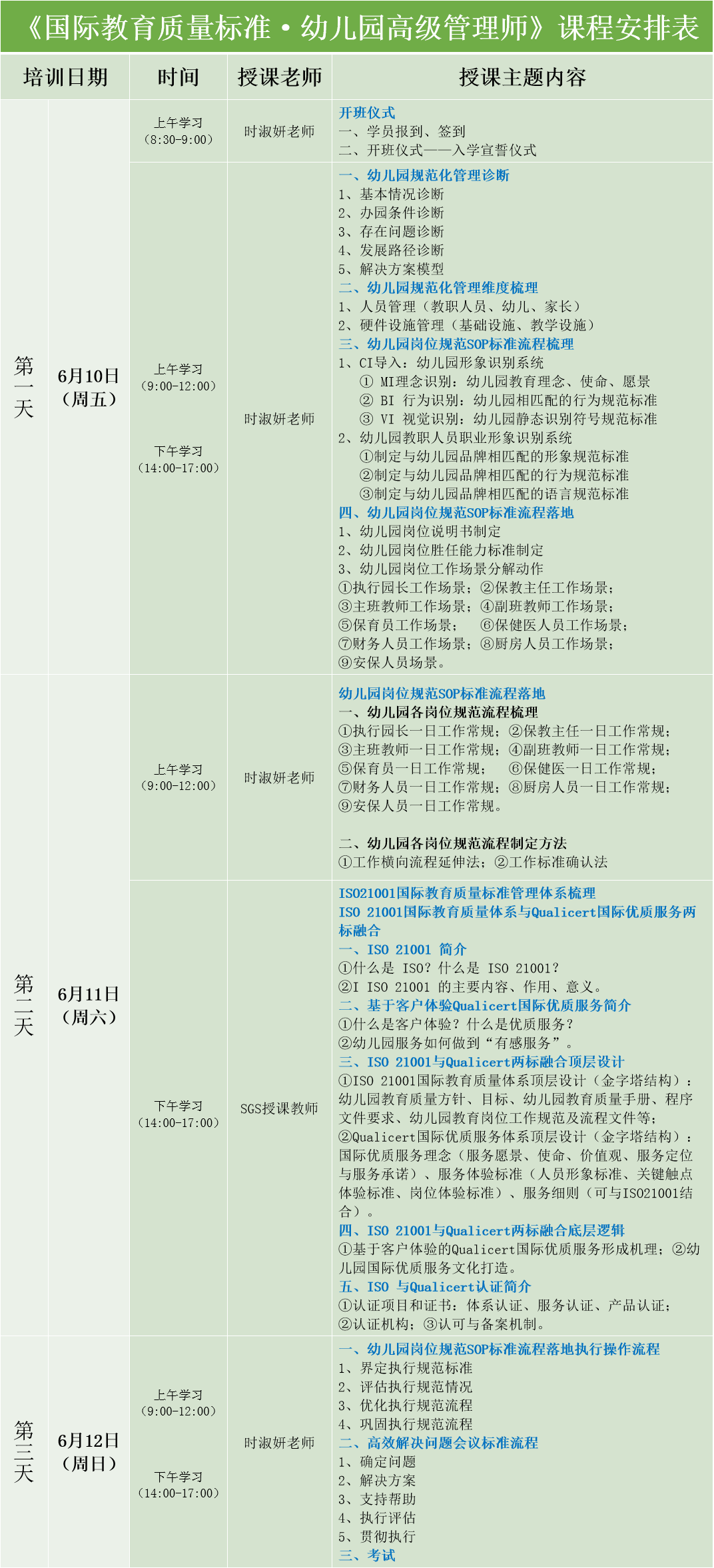 為了解決學(xué)前教育機(jī)構(gòu)管理人才培養(yǎng)、儲(chǔ)備的問(wèn)題,幫助學(xué)前教育機(jī)構(gòu)管理工作體系化、流程化、標(biāo)準(zhǔn)化、專業(yè)化與國(guó)際接軌,廣州市禮儀協(xié)會(huì)、廣州市德禮教育將于2022年6月10日—12日在廣州開(kāi)展《國(guó)際教育質(zhì)量標(biāo)準(zhǔn)化·幼兒園高級(jí)管理師》培訓(xùn)班。詳情如下: