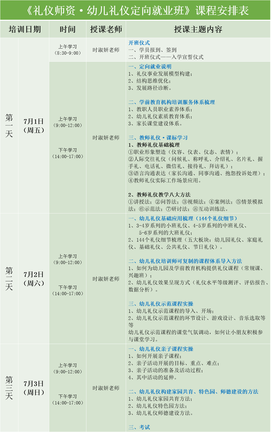 為加快高素質禮儀培訓師人才培養(yǎng)的步伐,增強禮儀培訓師細分領域授課能力,全面提升禮儀培訓師實際應用解決問題能力,現面向以服務學前教育機構(教職人員、幼兒、家長)的禮儀培訓為職業(yè)發(fā)展方向人員,開展定向禮儀師資就業(yè)班。