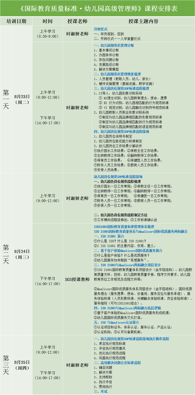 為培養(yǎng)幼兒園高素質(zhì)管理人才,提升幼兒園科學(xué)、規(guī)范、高效管理工作,根據(jù)國(guó)際標(biāo)準(zhǔn)ISO 21001《教育組織管理體系—要求及使用指南》,結(jié)合《幼兒園崗位規(guī)范行為SOP標(biāo)準(zhǔn)流程管理體系》,通過(guò)系統(tǒng)化的教職工培養(yǎng)、規(guī)范化的工作流程,可視化的管理成果,把常規(guī)管理引向精細(xì)化管理,包括各項(xiàng)工作進(jìn)一步細(xì)化、量化、流程化、標(biāo)準(zhǔn)化。運(yùn)用可操作、可復(fù)制、可評(píng)估的落地執(zhí)行的工具,實(shí)現(xiàn)幼兒園國(guó)際化教育質(zhì)量管理。
